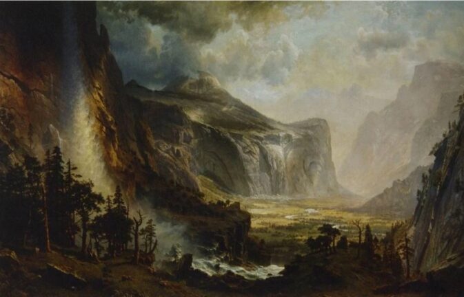 Albert Bierstadt painting The Domes of the Yosemite, 1867 from Paintings of Yosemite courtesy of Yosemite National Park U.S. National Park Service painting includes Yosemite Falls and Half Dome