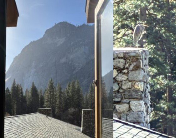 Ahwahnee hotel library suite view of Glacier point and heron on roof and on chimney